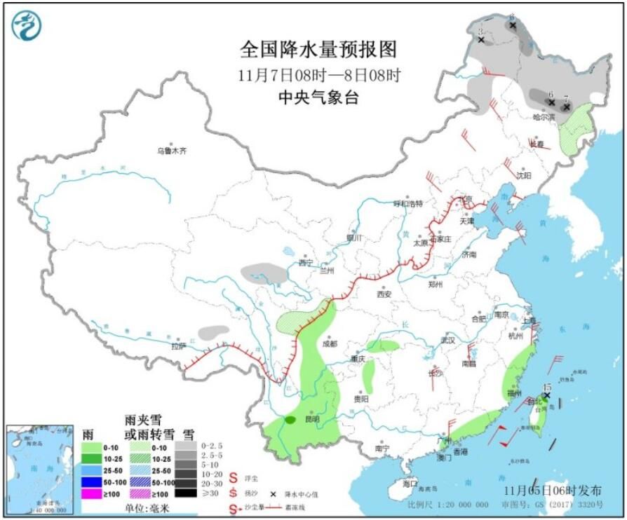 图2 全国降水量预报图(11月6日08时-7日08时)