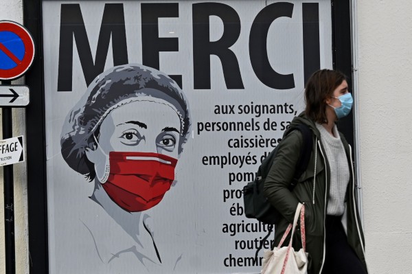 11月2日,一名行人戴着口罩走过法国雷恩街头一张致敬防疫工作者的海报。新华社 图