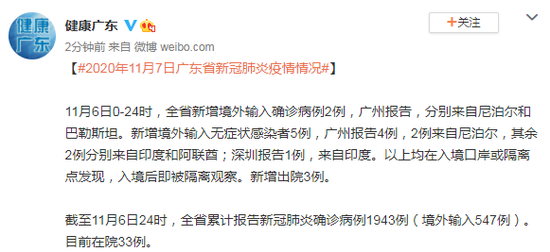 荔枝新闻讯 据健康广东消息,11月6日0-24时,全省新增境外输入确诊病例2例,广州报告,分别来自尼泊尔和巴勒斯坦。新增境外输入无症状感染者5例,广州报告4例,2例来自尼泊尔,其余2例分别来自印度和阿联酋;深圳报告1例,来自印度。以上均在入境口岸或隔离点发现,入境后即被隔离观察。新增出院3例。