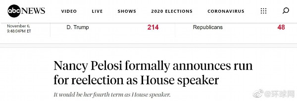 据美国广播电视公司(ABC)当地时间6日晚消息,美国国会众议院议长佩洛西正式宣布竞选连任。