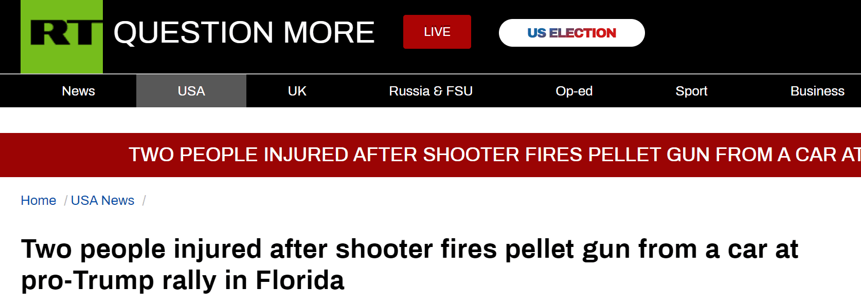 据“今日俄罗斯(RT)”刚刚消息,佛罗里达州一场支持特朗普的集会活动发生枪击事件,导致2人受伤。