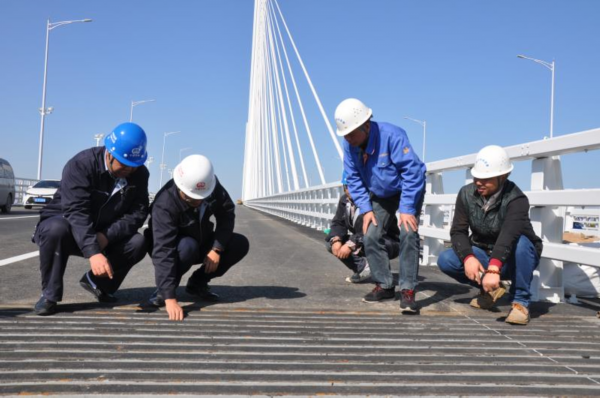 工人正在桥面两端的伸缩缝上安装缓冲皮带