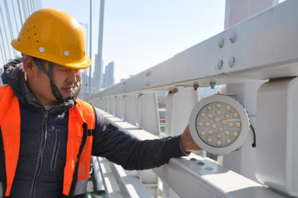 大桥护栏上设置的路灯下,还有专门安装的雾灯,江面上起雾时,可以为车辆提供辅助照明和引导。