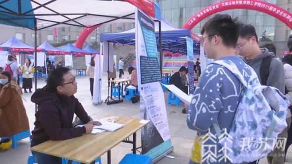 上午,在淮阴工学院图书馆前广场上,不少大学应届毕业生手持简历,游走在各个招聘企业的摊位前,了解企业情况,寻找合适的岗位。也有不少学生坐下来和企业面对面的交谈,通过相互沟通了解之后,顺利签下了三方协议。