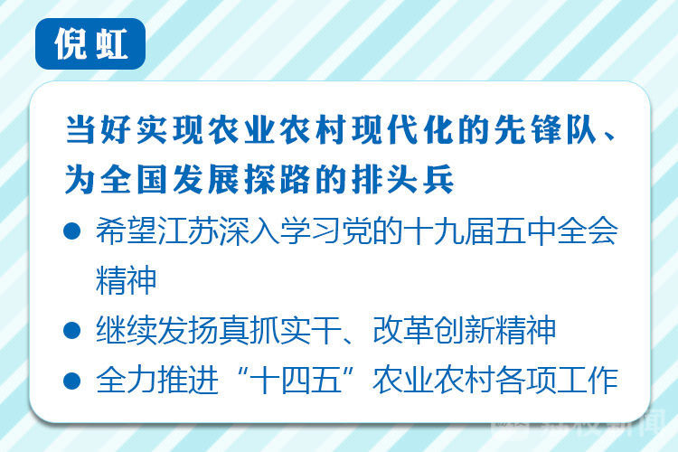 倪虹在沟通会上讲话,他指出,江苏省委、省政府深入贯彻习近平总书记关于“三农”工作重要论述,认真落实《中国共产党农村工作条例》,以中央一号文件为引领,切实加强党对“三农”工作的全面领导,坚决贯彻农业农村优先发展总方针,坚决稳住“三农”基本盘,态度坚决、行动迅速、措施有力、作风务实、效果明显。江苏以推动农业农村高质量发展为导向,坚持以人民为中心发展思想,从农民群众最关心的事情入手,抓到群众心坎上;坚持物质文明和精神文明一起抓,提振农村精气神,孕育社会好风尚;坚持抓改革促发展、抓机制促创新,为农业农村现代化提供源源动力;瞄准农村社会“当家人”、乡村发展“领头羊”,打造坚强有力的村党支部书记队伍。工作中深化改革、善于创新,积累了好做法、好经验。希望江苏深入学习党的十九届五中全会精神,继续发扬真抓实干、改革创新精神,全力推进“十四五”农业农村各项工作,当好实现农业农村现代化的先锋队、为全国发展探路的排头兵。