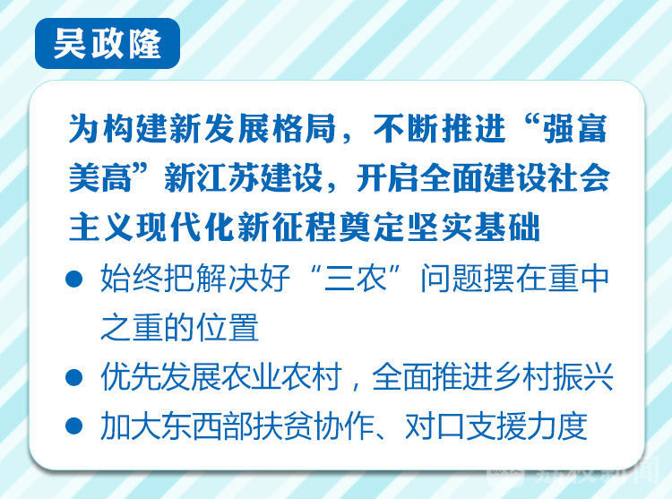 吴政隆说,督查组莅临江苏开展实地检查督查,充分体现了党中央、国务院对“三农”工作的高度重视,对江苏工作的关心支持。督查组对我省“三农”工作问诊把脉、全面体检,既找出问题“症结”,又开出整改“药方”。我们将坚持以习近平新时代中国特色社会主义思想为指导,深入贯彻习近平总书记关于“三农”工作重要论述和党中央、国务院重大决策部署,进一步提高政治站位,始终把解决好“三农”问题摆在重中之重的位置,坚持问题导向目标导向结果导向,坚决抓好整改落实工作,以实际行动实际成效践行初心使命、做到“两个维护”。我们将认真学习贯彻党的十九届五中全会精神,谋划好推动好“十四五”江苏“三农”工作,用好督查成果,落实好中央一号文件和“六稳”“六保”任务,优先发展农业农村,全面推进乡村振兴,加快农业农村现代化,同时加大东西部扶贫协作、对口支援力度,为构建新发展格局,不断推进“强富美高”新江苏建设,开启全面建设社会主义现代化新征程奠定坚实基础。