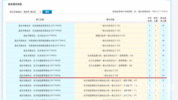 截至今天(11月7日),2021年江苏省公务员招录工作网上报名时间已经过半。本次计划招录9536人,截至下午四点,竞争最激烈的岗位在南京市溧水区,招录一人,已经有347人报名。