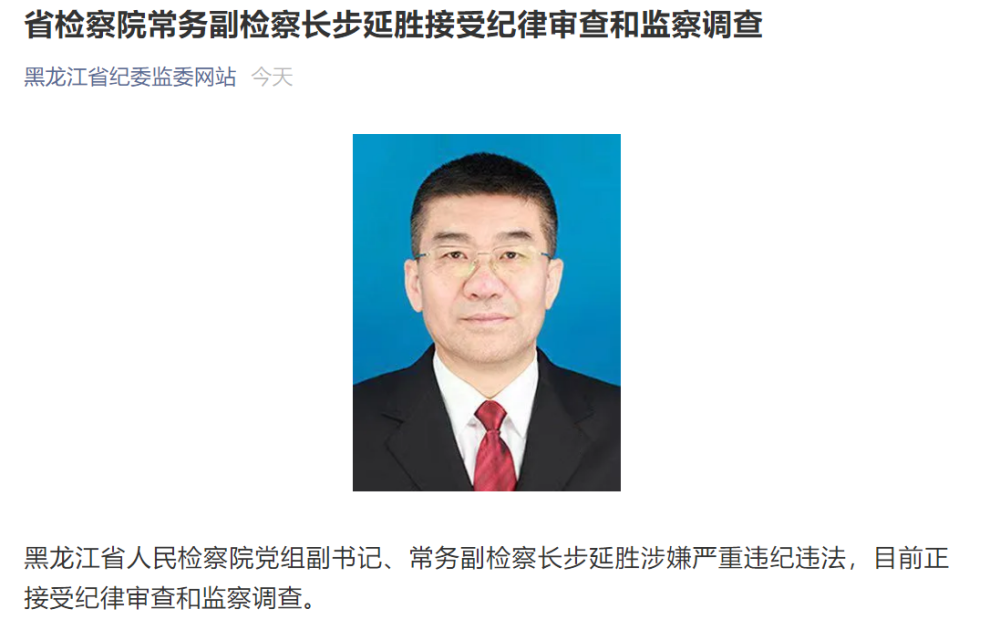 据黑龙江省纪委监委网站官方公众号消息,黑龙江省人民检察院党组副书记、常务副检察长步延胜涉嫌严重违纪违法,目前正接受纪律审查和监察调查。