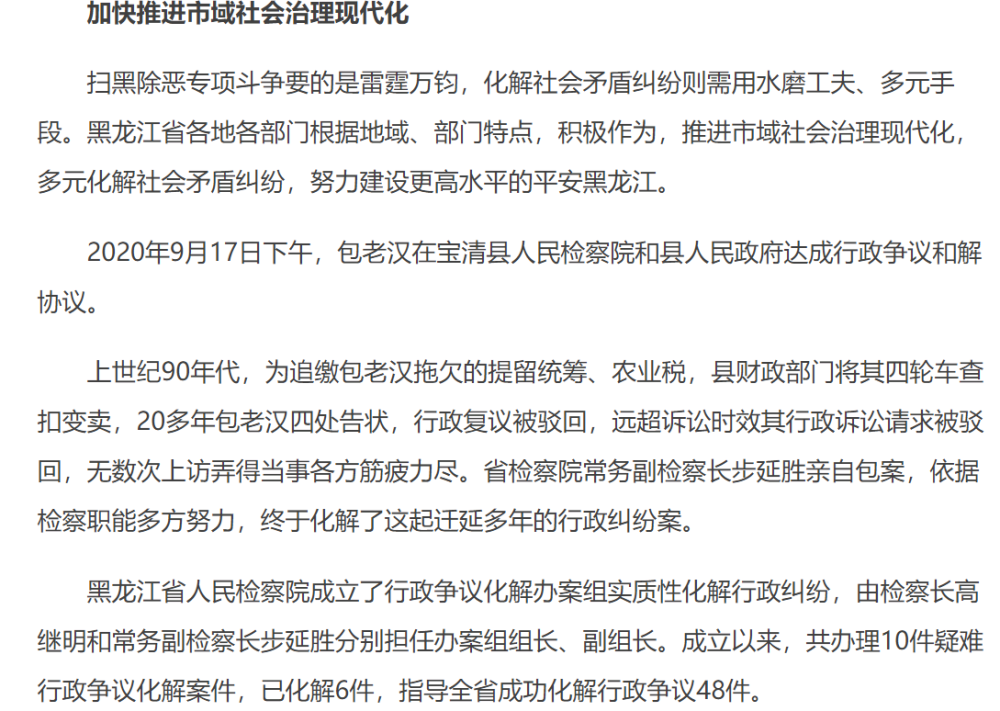 11月2日,平安龙江网发表的一篇《多措并举 戮力同心 用公平正义的法治环境 服务经济社会发展大局》也提到了步延胜。当中提到黑龙江省检察院常务副检察长步延胜亲自包案,依据检察职能多方努力,终于化解了一起迁延20多年的行政纠纷案。
