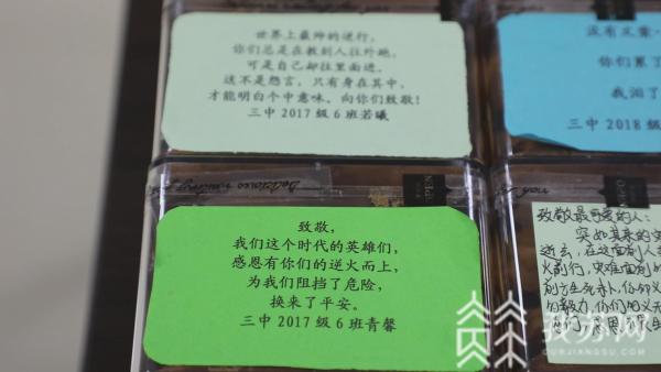 记者看到20盒饼干上张贴着20名学生的祝福语。