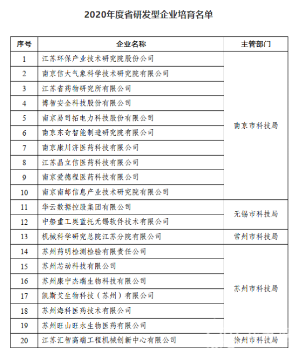 今天(11月8日)从江苏省科技厅获悉,2020年度培育的省研发型企业名单正式公布。