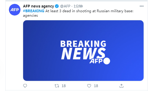 【环球网快讯】据法新社刚刚消息,俄罗斯军事基地发生枪击案,造成至少3人死亡。
