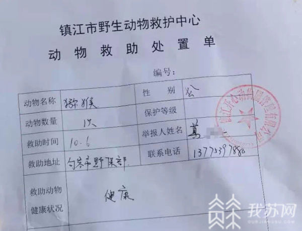 为防止猴子再次伤人,民警先行将围观群众劝离,然后利用网兜等器械,采取分头包抄的办法,对猴子进行“追捕”。经过近2个小时的斗智斗勇,民警成功用网兜将其罩住,“泼猴”终于“落网”!随后,民警立即与镇江市野生动物救护中心取得联系,经中心工作人员辨认得知,这是一只猕猴,属于国家二级保护野生动物,在《中国濒危动物红皮书兽类》中被列为易危种。随后,民警将其交予救护中心带回。