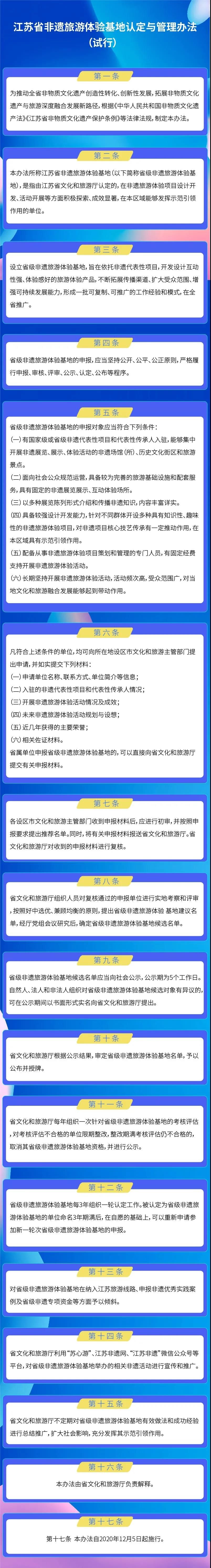 随着文旅融合不断推进,非遗与旅游“联姻牵手”,走进景区,活态展示,释放出非遗巨大的经济和社会价值,也为游客增添了更多精彩。日前,江苏省文化和旅游厅正式出台《江苏省非遗旅游体验基地认定与管理办法(试行)》,并将在全省范围内设立一批省级非遗旅游体验基地,满足怎样的条件可以申报?申报程序是什么?请看今日“江苏文旅头条”答疑解惑——