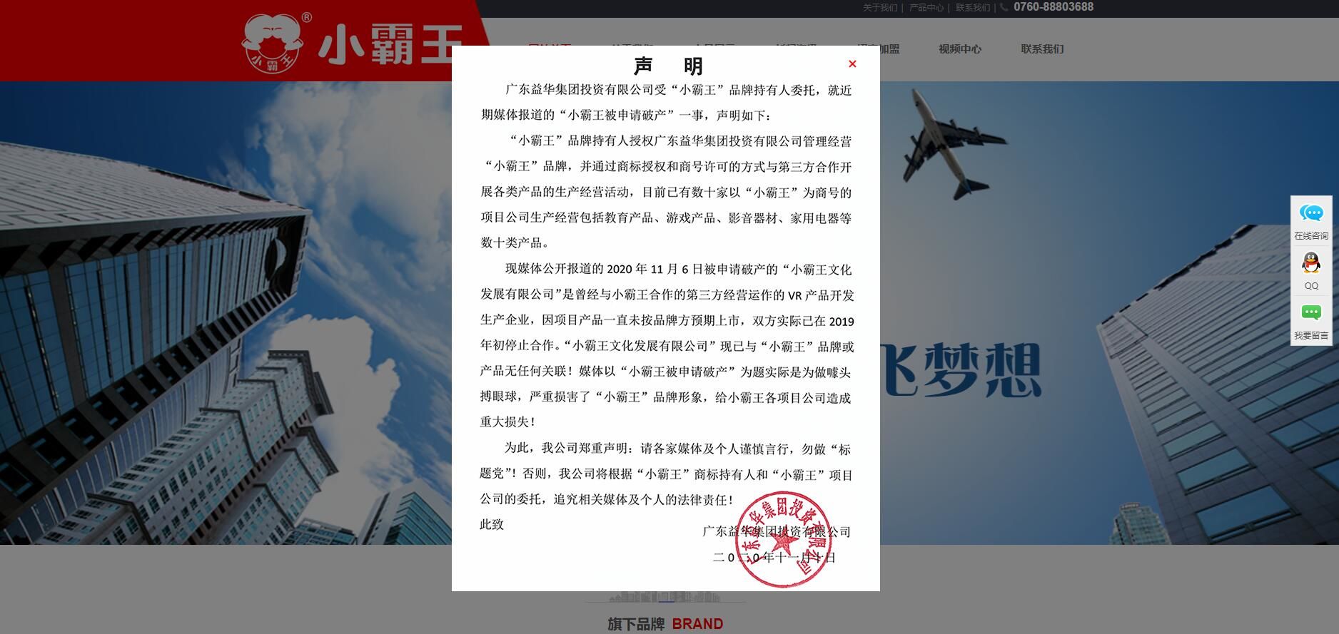 广东益华集团投资有限公司受“小霸王”品牌持有人委托,就近期媒体报道的“小霸王被申请破产”一事,声明如下: