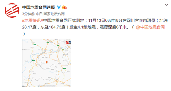 中国地震台网正式测定:11月13日03时18分在四川宜宾市珙县(北纬28.17度,东经104.73度)发生4.1级地震,震源深度6千米。