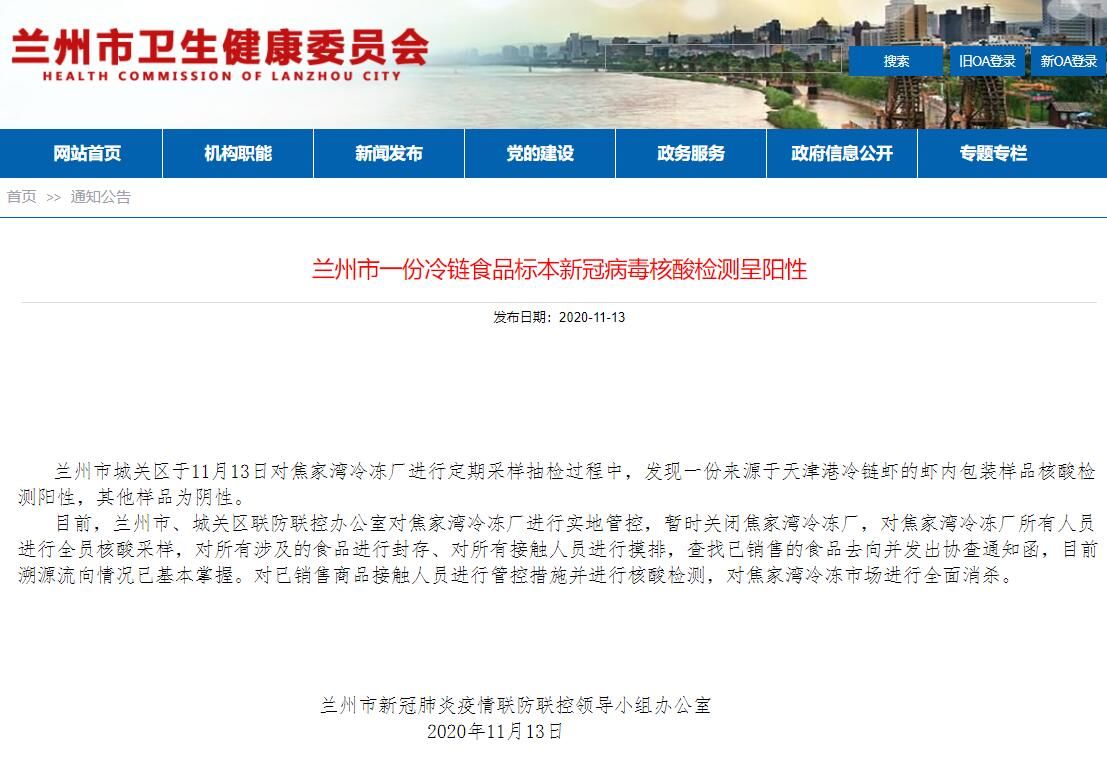 荔枝新闻讯 据兰州市卫健委网站消息,兰州市城关区于11月13日对焦家湾冷冻厂进行定期采样抽检过程中,发现一份来源于天津港冷链虾的虾内包装样品核酸检测阳性,其他样品为阴性。