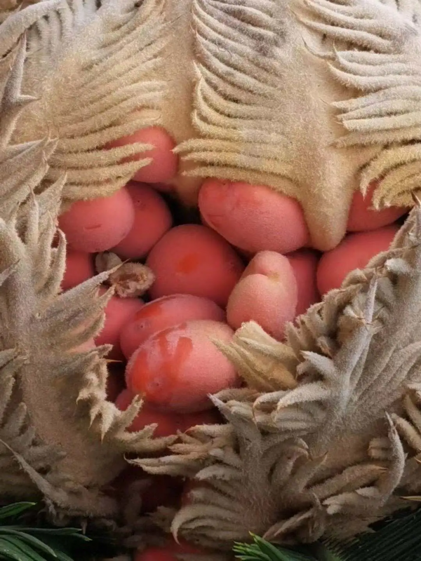 没错,真的挺好看的,有的地方,把铁树果实称为“凤凰蛋”,粉的果实包裹在密密麻麻的刺中,铁树的叶子就像是长长的凤尾。