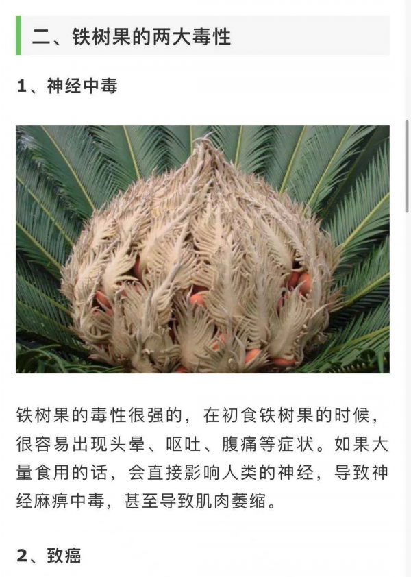 铁树果有神经毒性,直接食用,轻则恶心呕吐,头晕目眩,重则引起肝肾功能不全,可能致癌。