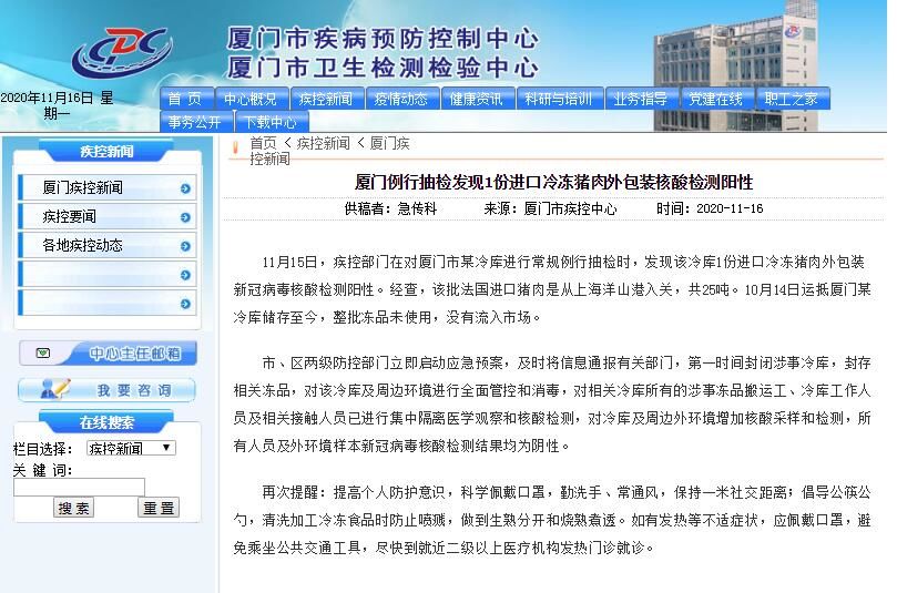 荔枝新闻讯 据厦门市疾病预防控制中心发布消息,11月15日,疾控部门在对厦门市某冷库进行常规例行抽检时,发现该冷库1份进口冷冻猪肉外包装新冠病毒核酸检测阳性。经查,该批法国进口猪肉是从上海洋山港入关,共25吨。10月14日运抵厦门某冷库储存至今,整批冻品未使用,没有流入市场。