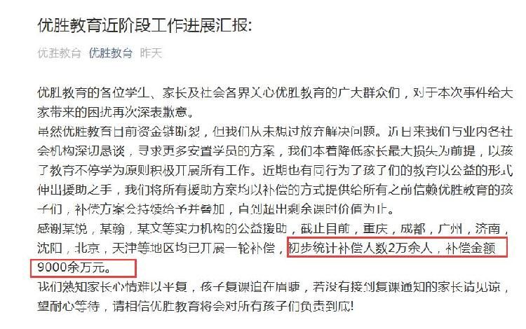 15日,“优胜教育”微信号发布阶段工作进展汇报,截至目前,重庆,成都,广州,济南,沈阳,北京,天津等地区均已开展一轮补偿,初步统计补偿人数2万余人,补偿金额9000余万元。