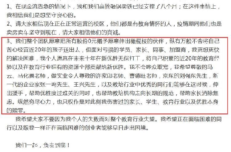 11月5日,优胜教育CEO陈昊发布《一个近20年教育行业创业者的致歉信》称,我们整个团队愿意把所有股份0元赠予愿意伸出橄榄枝的伙伴。他在信中还喊话马云、马化腾、许家印、曹德旺、刘强东、张一鸣、王兴等大佬伸出援手。