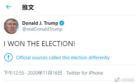 随后,他的这条推文被推特官方贴上标签“与官方消息源对这场选举判定的结果不同”。