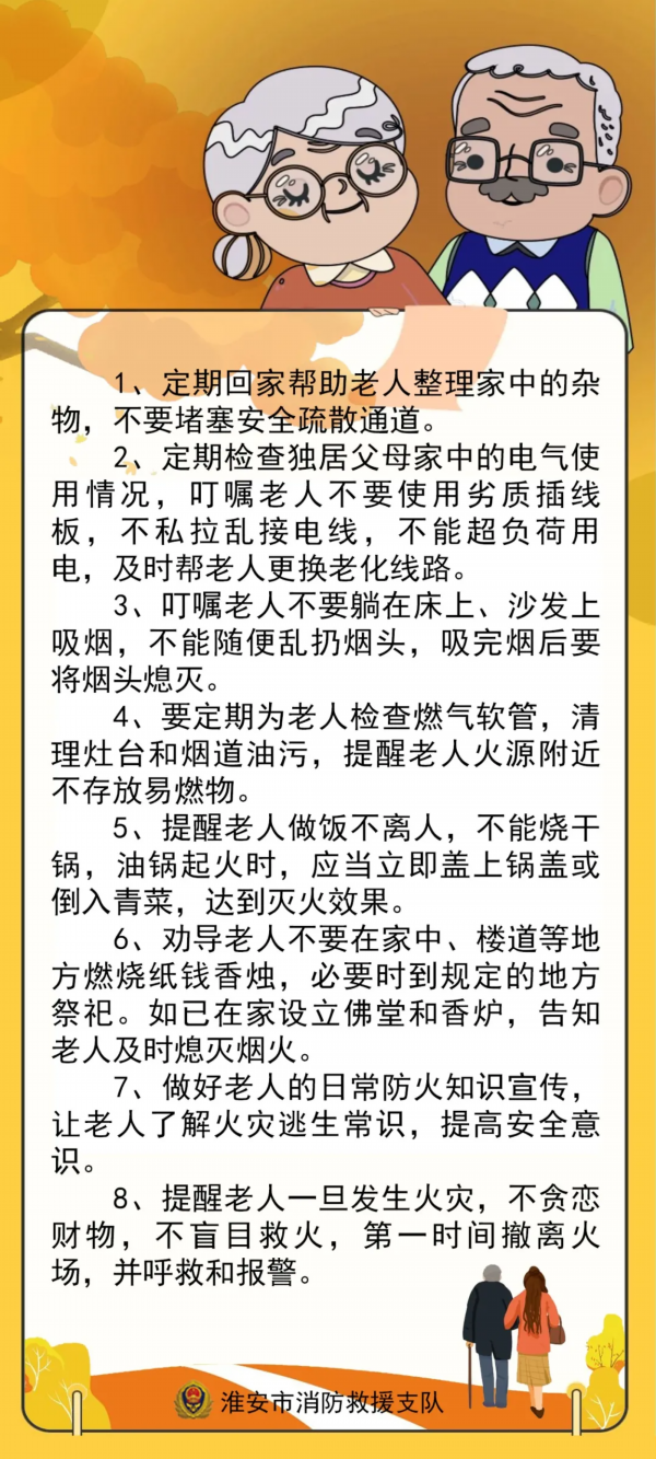 2、家中如有行动不便、耳聋眼花的老人,要有专人照看,尽量不要让老人独居在家。