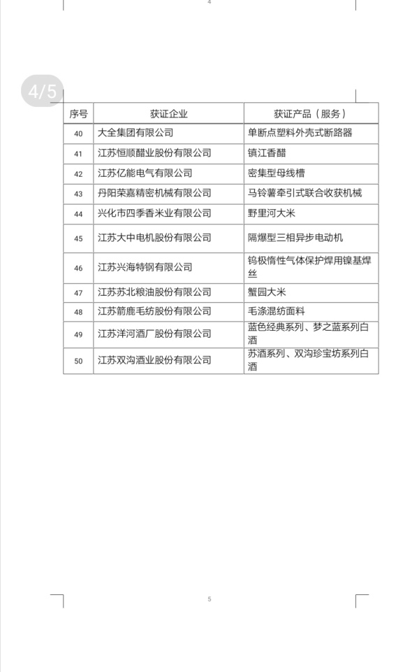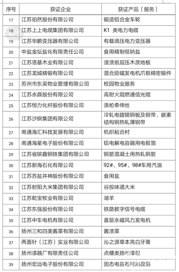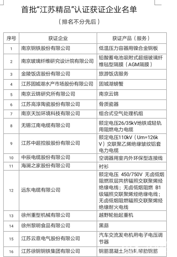 11月16日,江苏省召开首批“江苏精品”发布会,正式发布首批通过“江苏精品”认证的50家企业共56个产品(服务),涉及农业相关企业6家、制造业相关企业42家、服务业相关企业2家,基本涵盖了我省一二三产业的“龙头”企业和“拳头”产品。