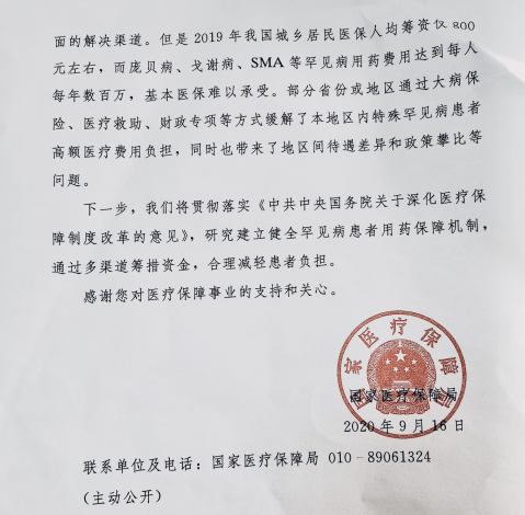 国家医保局九月的回函中称,医保部门高度重视罕见病患者的医疗保障工作,但考虑到2019年我国城乡居民医保“人均筹资仅800元左右”,对于“每年每人数百万”药费的戈谢病,基本医保“难以承受”。这一答复在黄细花看来“还不是很乐观”。此外答复还提到,部分地区对特殊罕见病患者高额医疗费用负担的缓解,“带来了地区间待遇差异和政策攀比等问题”,让黄细花不甚满意。