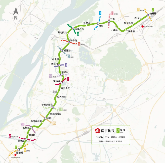 南京地铁7号线东起仙新路站,南至西善桥站,串联起西善桥、河西、下关、丁家庄、尧化门等片区,全线长35.49公里,共设车站27座,含换乘站13座。这条线是南京地铁线网中东北至西南走向的重要线路。同时,地铁7号线是南京市首条全自动无人驾驶的智能化地铁线路,未来将实现真正意义的“无人驾驶”。而7号线与现有的2、3、4、10号线、S3号线,在建的5号线、1号线北延线、2号线西延线、6、8、9、13号线都有换乘站点,是当之无愧的“换乘王”线路。