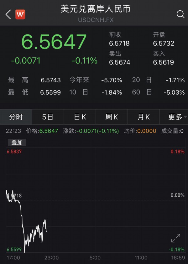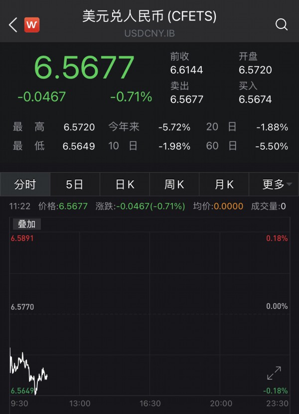 人民币对美元即期汇率11月17日以6.5720开盘,随后升破6.57关口,最高升值至6.5649,刷新前期高点并创下2018年6月下旬以来的新高。