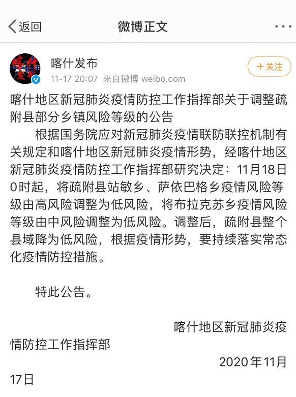 荔枝新闻讯 据喀什发布消息,根据国务院应对新冠肺炎疫情联防联控机制有关规定和喀什地区新冠肺炎疫情形势,经喀什地区新冠肺炎疫情防控工作指挥部研究决定:11月18日0时起,将疏附县站敏乡、萨依巴格乡疫情风险等级由高风险调整为低风险,将布拉克苏乡疫情风险等级由中风险调整为低风险。调整后,疏附县整个县域降为低风险,根据疫情形势,要持续落实常态化疫情防控措施。