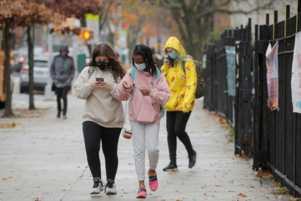 Students exit a school as the spread of coronavirus disease (COVID-19) continues, in Brooklyn, New Yor, Nov 13, 2020. [Photo/Agencies]