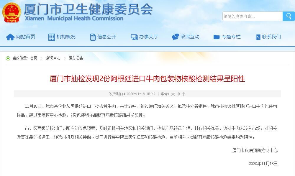 荔枝新闻讯 据厦门市卫健委网站消息,11月18日,厦门市某企业从阿根廷进口一批去骨牛肉,共计27吨,通过厦门海关关区,拟运往外省销售。厦门市抽检该批阿根廷进口牛肉包装物样品,经过市疾控中心检测,2份包装物样品新冠病毒核酸结果呈阳性。