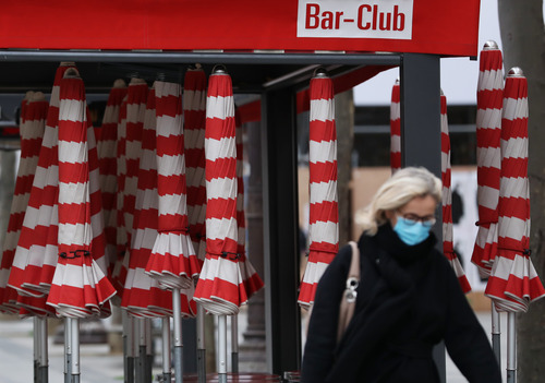 10月30日,一名女子走过法国巴黎香榭丽舍大街上一家关门的餐厅。新华社记者 高静 摄