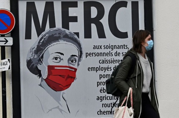 11月2日,一名行人戴着口罩走过法国雷恩街头一张致敬防疫工作者的海报。新华社/法新
