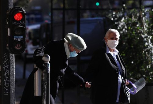 11月9日,两名老人在法国巴黎街头过马路。新华社记者 高静 摄