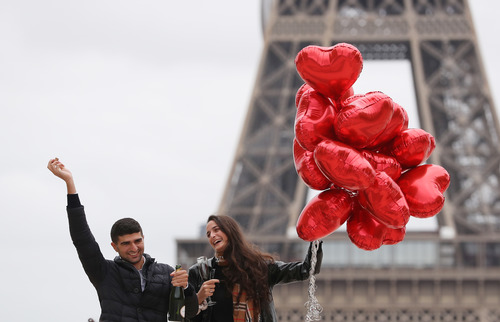 10月30日,一对新人在法国巴黎埃菲尔铁塔附近的特罗卡德罗广场庆祝订婚。新华社记者 高静 摄