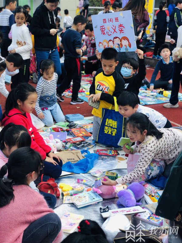 孩子们密切配合、分工明确。所售物品琳琅满目,推销手段也是五花八门,有的推出了“买书送玩具”的大优惠,有的则与“小掌柜”讨价还价……孩子们全身投入,各显本领,“爱心集市”生意火爆,成为校园里一道亮丽的风景。活动还吸引了部分老师和家长,他们和同学们一起,讨价还价,乐在其中。