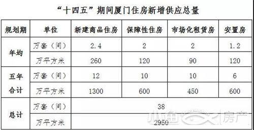 根据《厦门市住房发展规划(2021-2025年)》(公示稿),“十四五”期间将保持住房总量平稳增长,不断提高城乡居民人均住房面积,新增住房供应总量约38万套,面积2950万平方米。其中,商品住房供应量约12万套,面积1300万平方米,占比约45%。