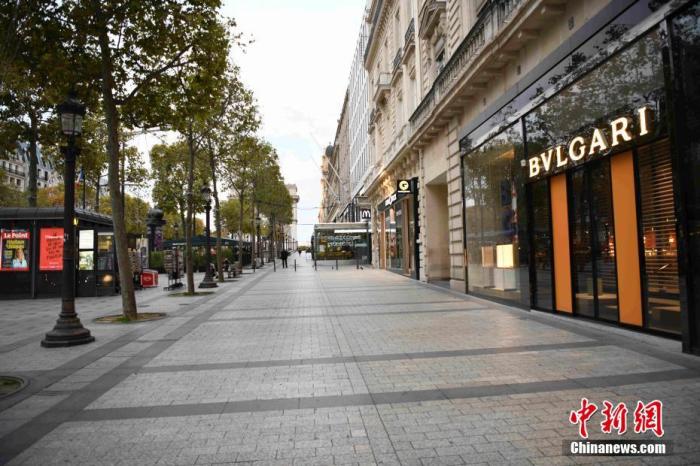 资料图:当地时间10月30日,法国进入第二次全国“封城”,以应对新冠肺炎疫情恶化。民众的非必要出行被禁止,非必需公共场所关闭。图为当天巴黎香榭丽舍大街几乎没有行人,大多数店铺关闭。 中新社记者 李洋 摄