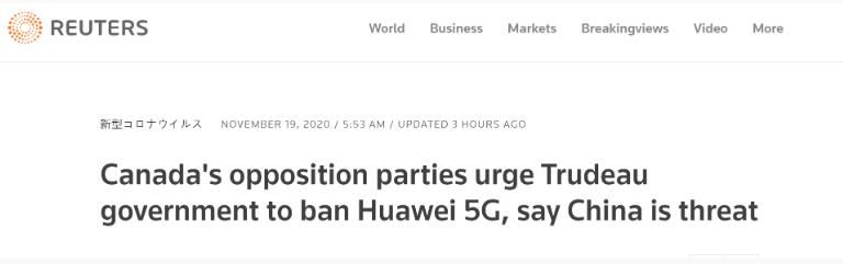 【环球网报道】加拿大反对党通过了一项针对中国、针对华为的动议,但“不具有约束力”。据路透社消息,在保守党的推动下,加拿大反对党18日通过了一项动议,敦促总理特鲁多的自由党政府对中国更强硬,包括正式禁止华为5G技术。
