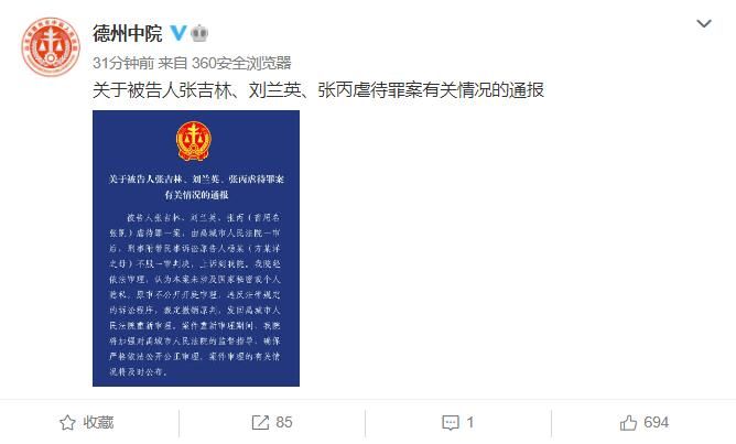 荔枝新闻讯 11月19日中午,德州中院官方微博发布关于被告人张吉林、刘兰英、张丙虐待罪案有关情况的通报 ,通报称原审不公开开庭审理,违反诉讼程序,裁定撤销原判,发回重审。