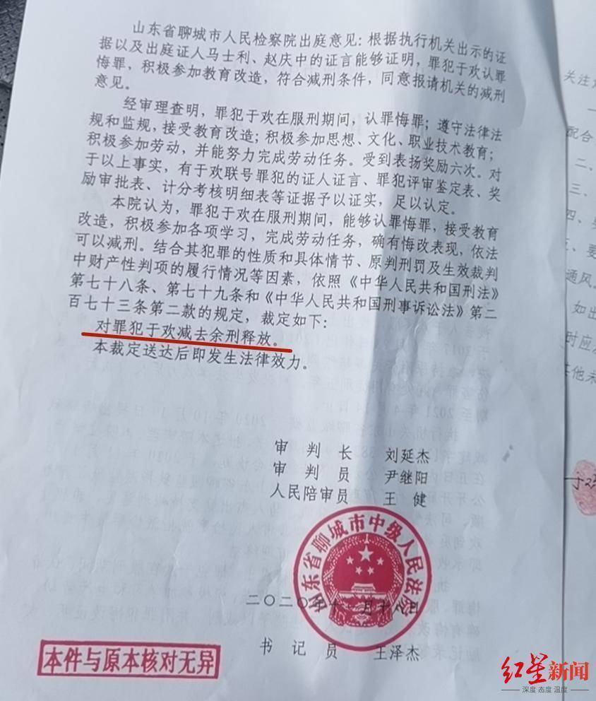 聊城中院在《刑事裁定书》中称,罪犯于欢在服刑期间,能够悔罪认罪,接受教育改造,积极参加各项学习,完成劳动任务,确有悔改表现,依法可以减刑。