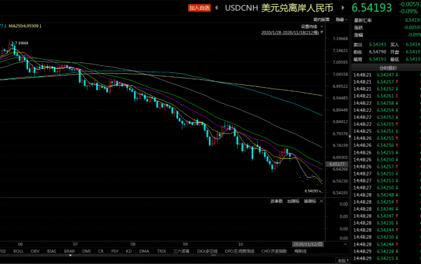 11月18日,美元指数继续走弱,离岸人民币一度升破6.53关口。同日,人民币对美元中间价较上一交易日调升169个基点,报6.5593。