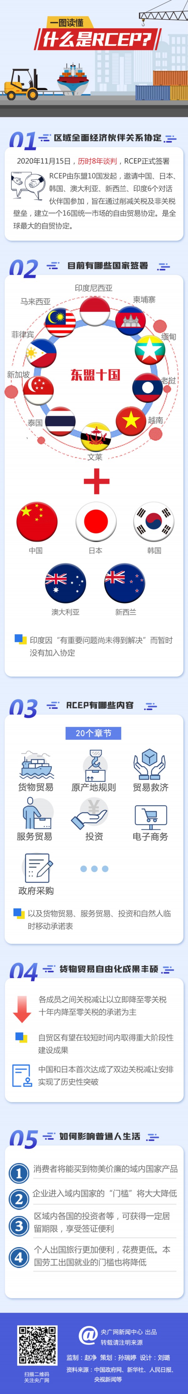 2020年11月15日,区域全面经济伙伴关系协定(RCEP)历经8年谈判正式签署。全球最大的自由贸易区宣告诞生,正式启航。啥是RCEP?它的签署将如何影响我们的生活?看图,帮你快速了解!