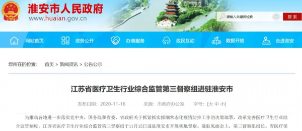 本次督察是坚持习近平新时代中国特色社会主义思想、深入学习贯彻党的十九届五中全会和习近平总书记关于新冠肺炎疫情防控重要讲话和指示批示精神、落实《国务院办公厅关于改革完善医疗卫生行业综合监管制度的指导意见》以及省政府办公厅印发的《江苏省改革完善医疗卫生行业综合监管实施方案》的具体要求,是防范化解重大疫情和突发公共卫生风险、全面推动建立医疗卫生行业综合监管制度、切实维护人民健康的重要举措,是督察组和地方政府共同承担的政治责任和政治任务。