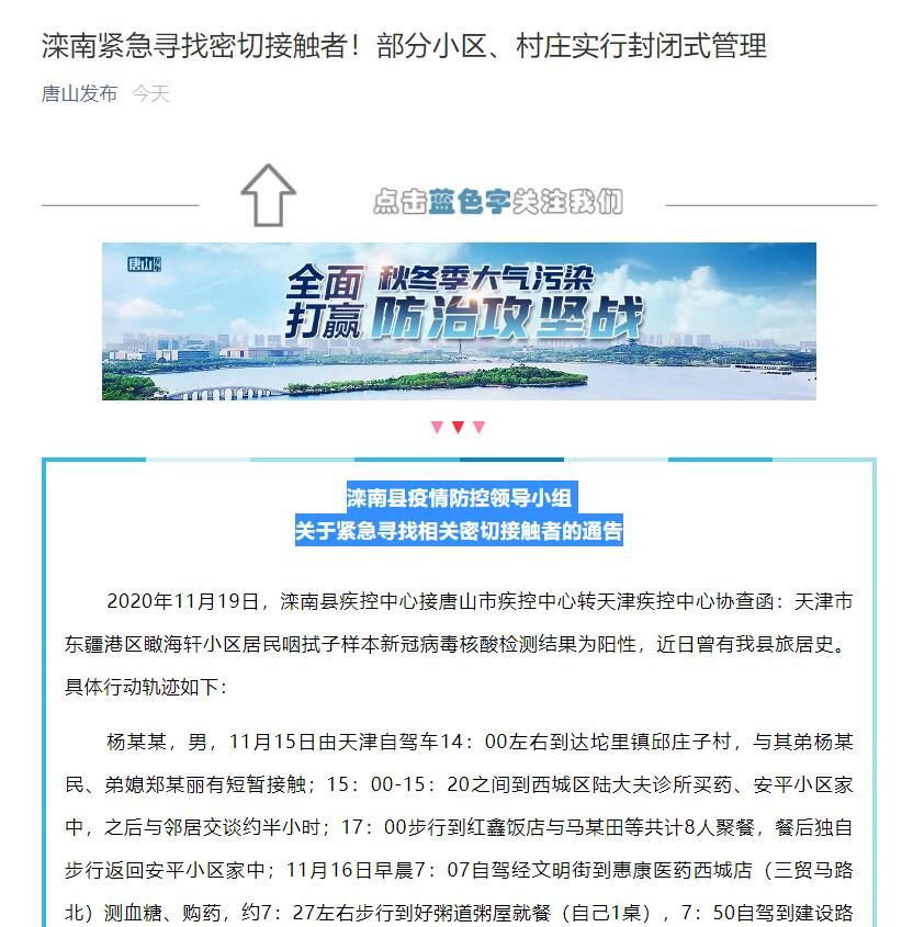 荔枝新闻讯 11月20日,“唐山发布”官方微信发布了滦南县疫情防控领导小组关于紧急寻找相关密切接触者的通告,称天津市东疆港区瞰海轩小区居民咽拭子样本新冠病毒核酸检测结果为阳性,近日曾有滦南县旅居史。目前,部分小区、村庄实行封闭式管理。全文如下: