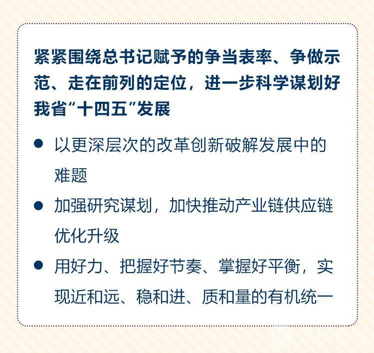 娄勤俭说,要深刻理解把握五中全会提出的宏伟目标、战略重点、任务举措,紧紧围绕总书记赋予的争当表率、争做示范、走在前列的定位,进一步科学谋划好我省“十四五”发展。娄勤俭从如何理解“在改革创新、推动高质量发展上争当表率”、“在服务全国构建新发展格局上争做示范”、“在率先实现社会主义现代化上走在前列”等三个方面作了深入阐述。他指出,在新发展阶段,江苏争当表率,首先必须在科技创新、产业体系、区域发展、城乡发展、生态建设等重点领域得到体现;必须依靠改革创新这个法宝,以更深层次的改革创新破解发展中的难题,激活发展新动力,加快实现更高质量、更有效率、更加公平、更可持续、更为安全的发展。娄勤俭指出,争做示范要重点关注“循环链条”“循环基础”“循环通道”“循环保障”等方面,加强研究谋划,加快推动产业链供应链优化升级,大力培育完整内需体系,积极构建现代流通体系,不断畅通向东向西双向开放通道,统筹发展和安全,在服务全国构建新发展格局中大胆探索、多作贡献。娄勤俭强调,现代化建设在“率先”的地区中走在前列,不是要求时时事事都争第一,更不能为了一时的领先压力而影响到落实新发展理念的定力,必须用好力、把握好节奏、掌握好平衡,实现近和远、稳和进、质和量的有机统一。对照我国建设社会主义现代化的五个方面特征,我们要深刻理解总书记对江苏现代化建设的要求,认识江苏现代化实践在全国的意义,切实扛起使命,更加主动展开前瞻性、创新性探索,创造更多制度性成果、规律性经验。